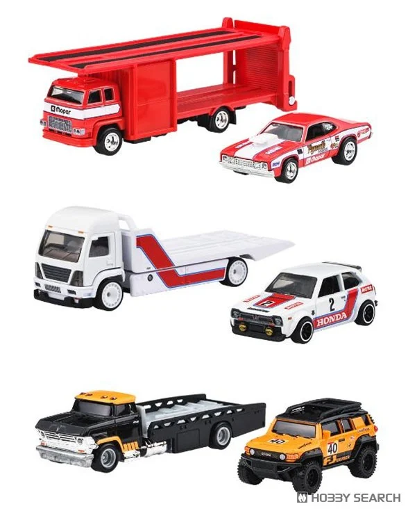 Se ha lanzado un nuevo surtido de la serie Team Transport, que incluye un vehículo de carreras y su portaequipajes! Incluye el Honda Civic Custom del 73, el Plymouth Duster del 73 y el Toyota FJ Cruiser, todos con nuevas decoraciones.