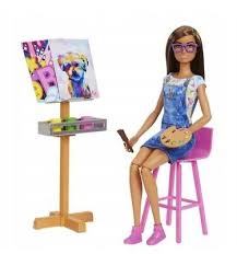 ¡Sumerge la esponja en agua fría y pinta las piezas para revelar increíbles diseños! Usa la muñeca Barbie incluida para jugar aún más historias; coloca su caballete con 2 lienzos diferentes.